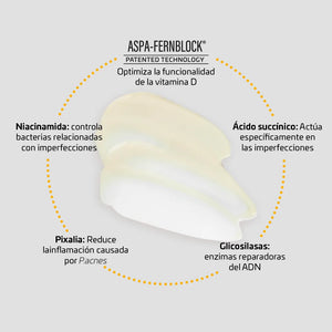 Fotoprotección especializada de amplio espectro (UVB, UVA, visible, infrarroja), SPF 50+, de uso diario para pieles grasas con tendencia acneica. Acción anti-imperfecciones y seborreguladora gracias a un sistema específico compuesto por ácido succínico y niacinamida. Gracias a su sistema matificante, mantiene la piel matificada durante más de 12 horas, reduciendo la secreción sebácea en un 42%, tras 28 días de aplicación.